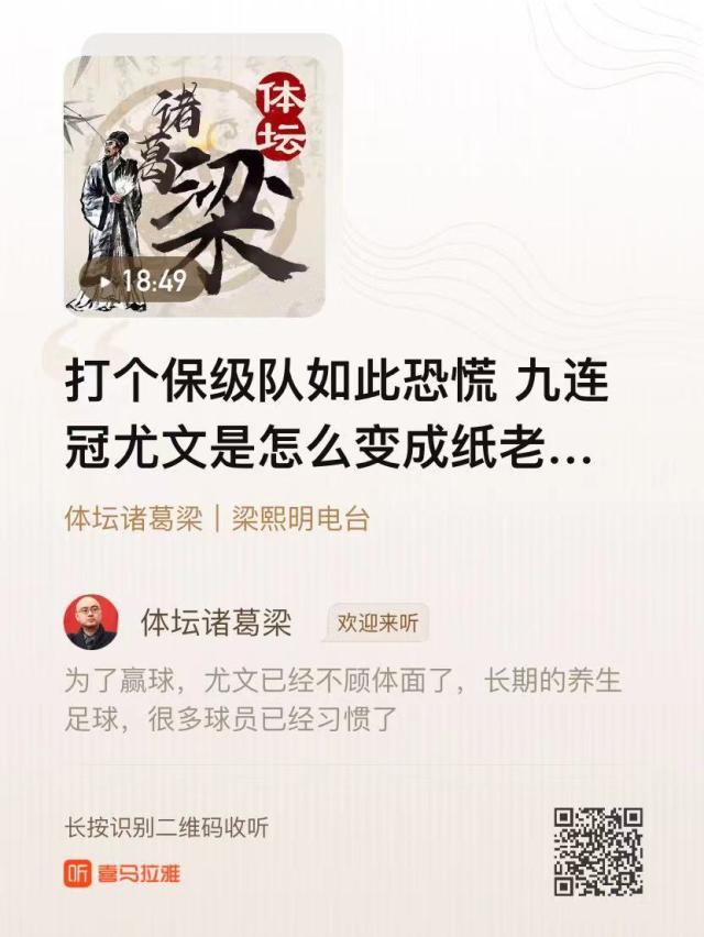 由《体坛周报》与喜马拉雅FM联合推出的播客节目——《体坛诸葛梁丨梁熙明电台》正式上线。 为了赢球,尤文已经不顾体面了,长期的养生足球,很多球员已经习惯了。 点击下方链接,或登录喜马拉雅搜索“体坛诸葛梁”,即可收听节目,与梁熙明就足坛热点展开交流。 打个保级队如此恐慌 九连冠尤文是怎么...